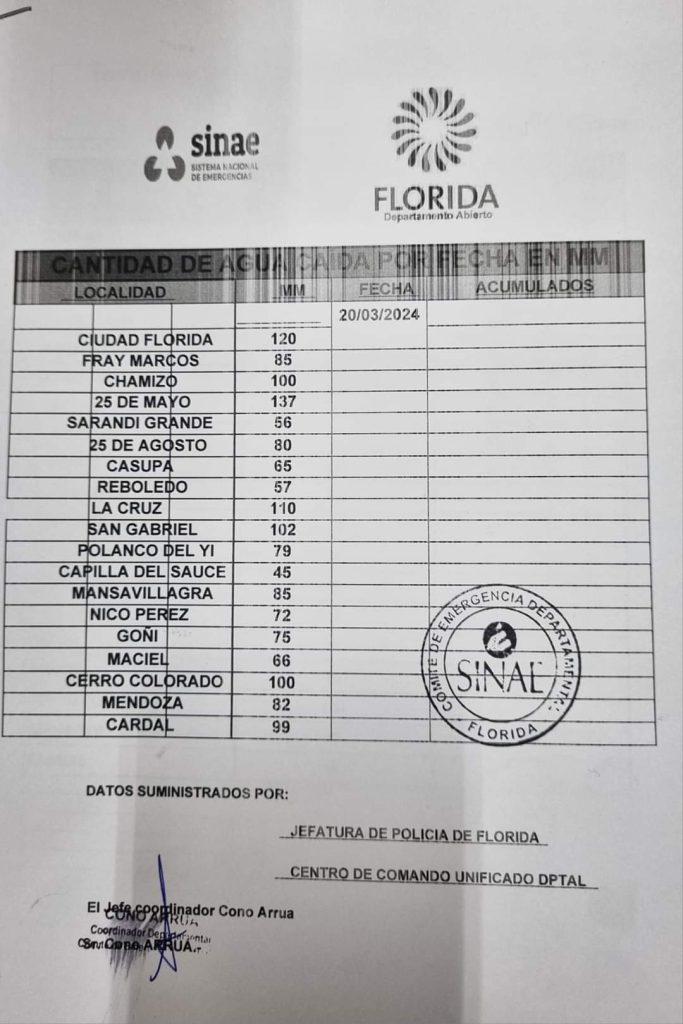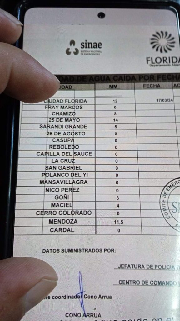 Luis Martinez desde el Instituto Uruguayo de Meteorología (Estación Florida) nos informa que en Florida el total acumulado en las últimas 96 hs es de 281 mm.Además según los registros oficiales en lo que va del mes de Marzo el total es de 375.5 mm.Acá la planilla correspondiente a los datos de las últimas horas […]