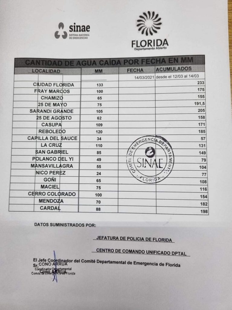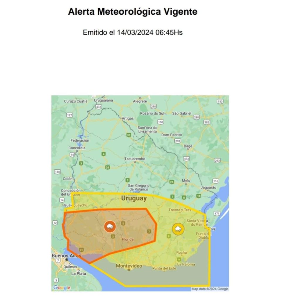 El Inumet mantiene en su último informe sobre Alerta Meteorológica en nivel Naranja a 25 de Mayo, Alejandro Gallinal, Capilla del Sauce, Cardal, Casupa, Florida, Goñi, Independencia, La Cruz,Mendoza, Mendoza Chico, Reboledo, San Gabriel y Sarandí Grande.En tanto emitió nivel amarillo para 25 de Agosto, Cerro Chato, Chamizo y Nico Pérez.La alerta también incluye varias […]