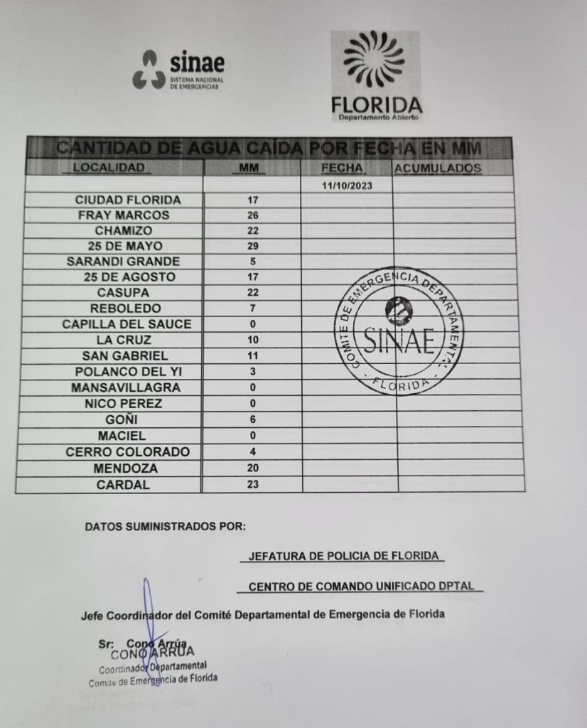 En las últimas horas, referente al agua caída, en Villa 25 de Mayo se registró 29mm.Dejamos a continuación el registro en todas las localidades del departamento de Florida.