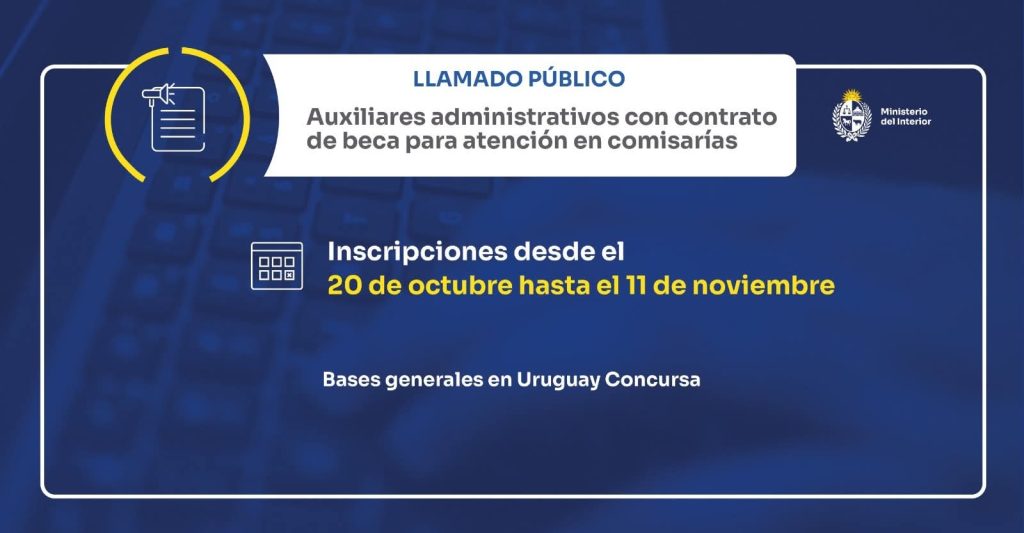El Ministerio del Interior abre inscripciones para auxiliares administrativos con contrato de beca para atención en comisarías. 🗓️ Plazo de inscripción: del 20 de octubre al 11 de noviembre 🔗 Conocé más sobre los requisitos y cómo postularte: https://www.gub.uy/ministerio-interior/comunicacion/noticias/ministerio-del-interior-abre-convocatoria-para-33-becas-auxiliares